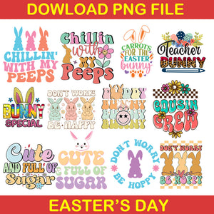 Files Included: PNG File: MCute Full Of Sugar Png, Bunny Special Png, Teacher bunny Png, Carrots for The Easter Bunny Png, Chilllin With My Peeps Png, Cousin Crew Png, Cute Full Of Sugar Png,.